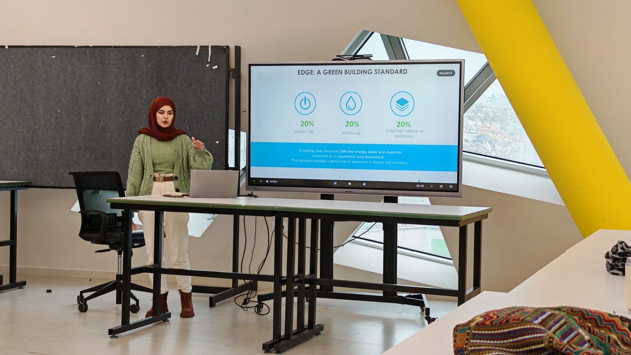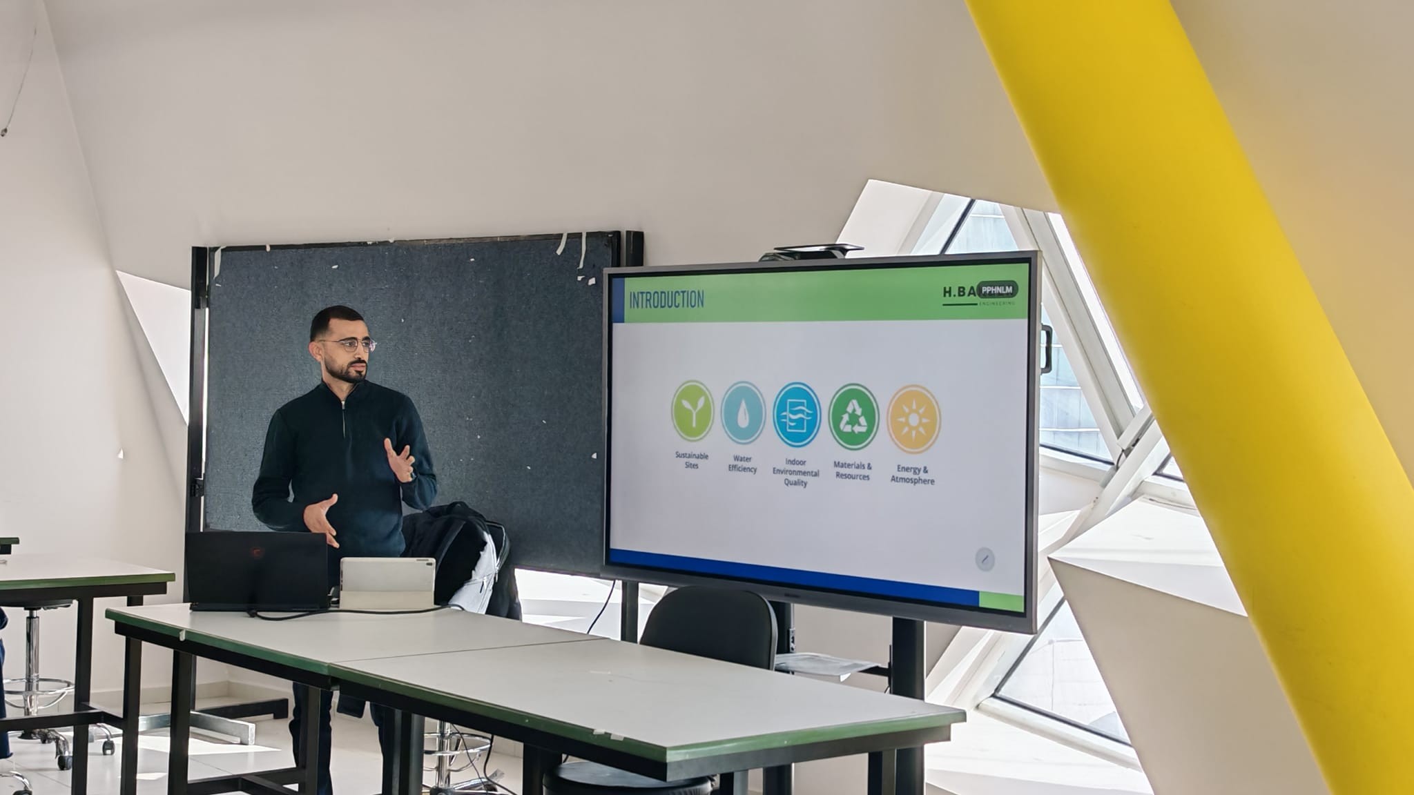 قدّم المجلس الفلسطيني للأبنية الخضراء محاضرتين توعويتين لطلاب برنامج (Eco Interior Design) في الجامعة العربية الأمريكية – الريحان، تناولت أنظمة عالمية لتقييم المباني الخضراء مثل LEED وEDGE، واستعرضت الإجراءات التحديثية (Retrofit) والمعايير البيئية المتبعة في المباني.